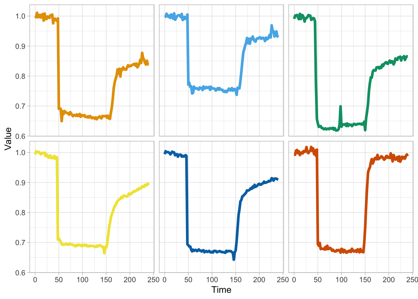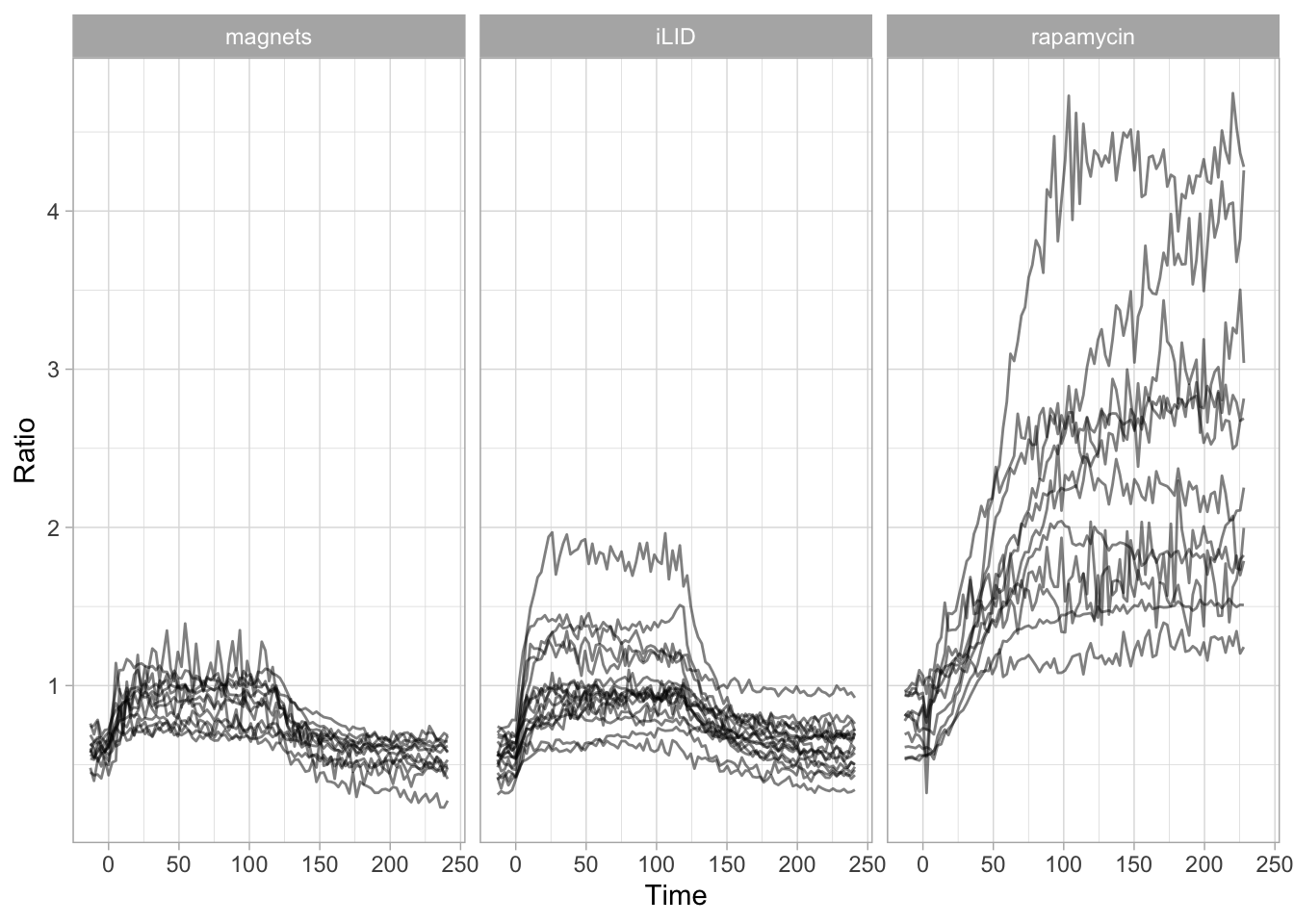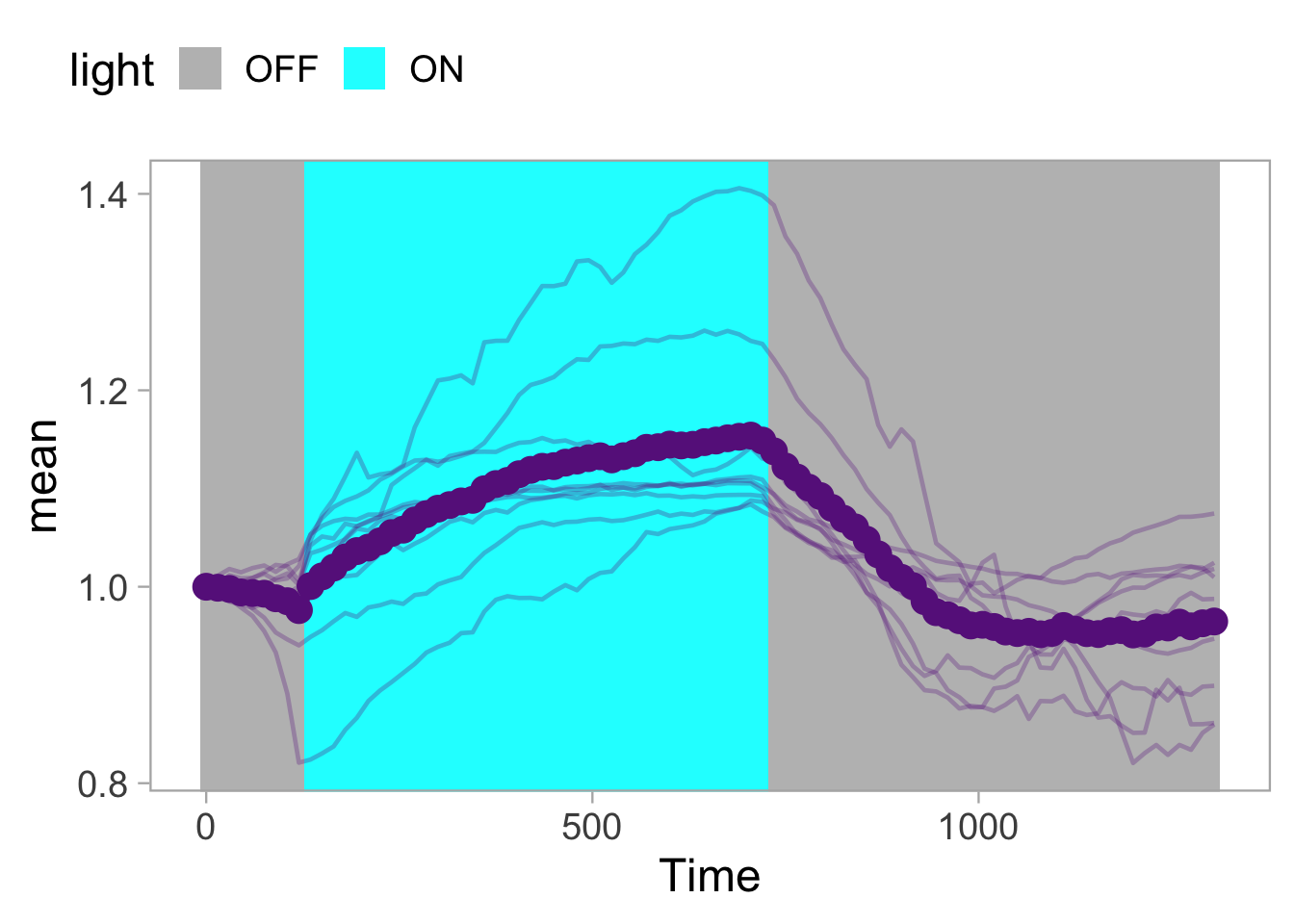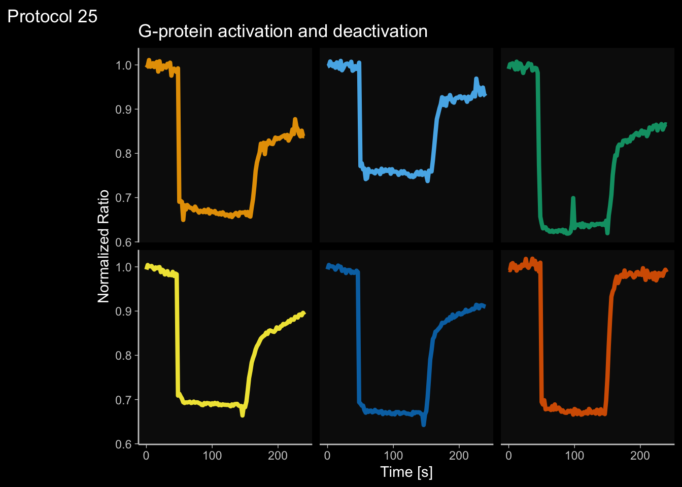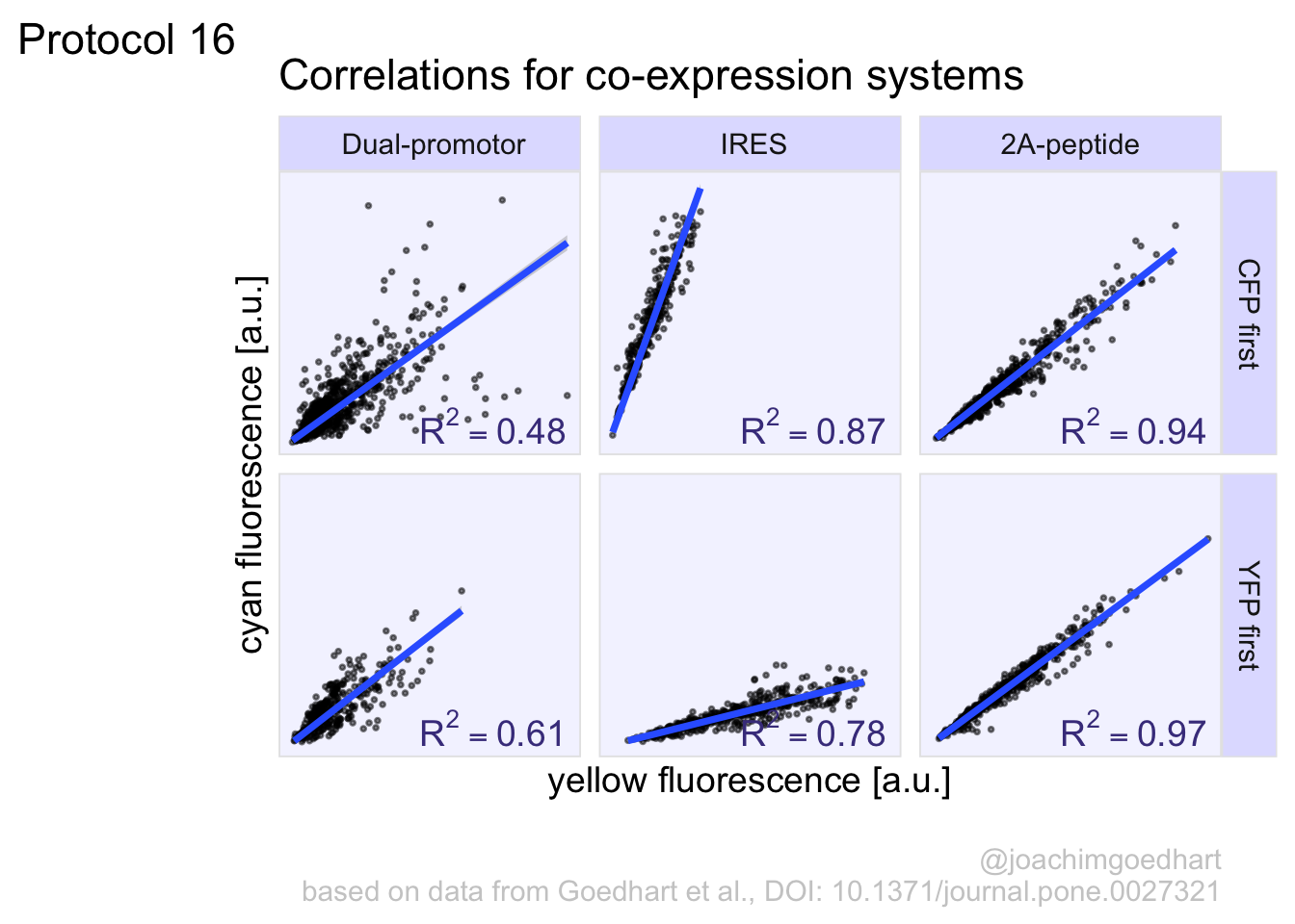 We are almost there, except that the colors of the plot do not match with the natural colors of the fluorescent proteins. Let’s fix that by defining a custom color palette. The order of the colors matches with the order of the fluorescent proteins that was defined earlier: