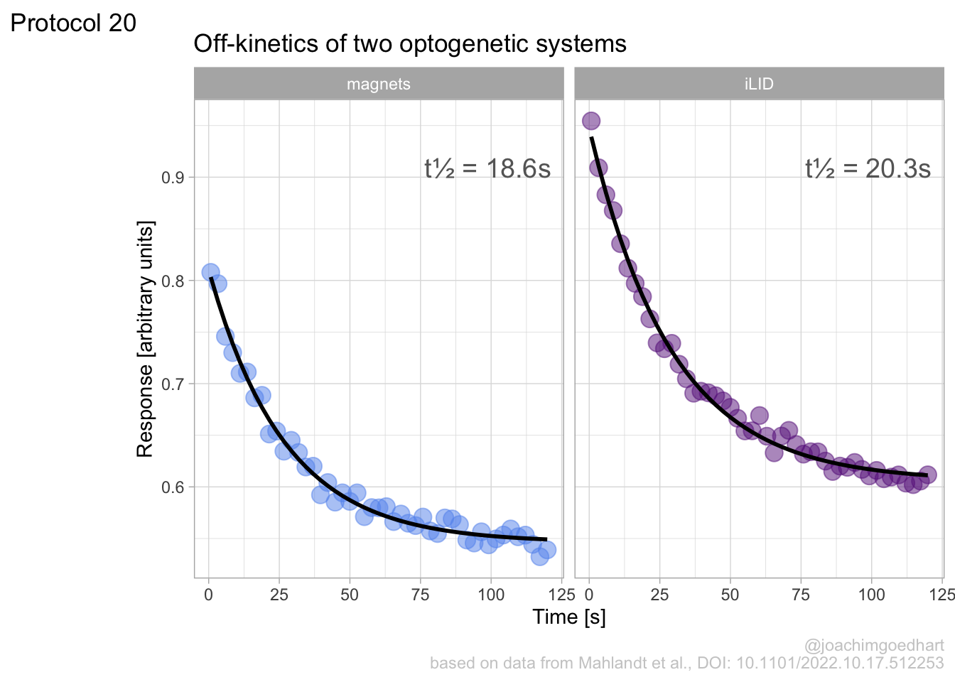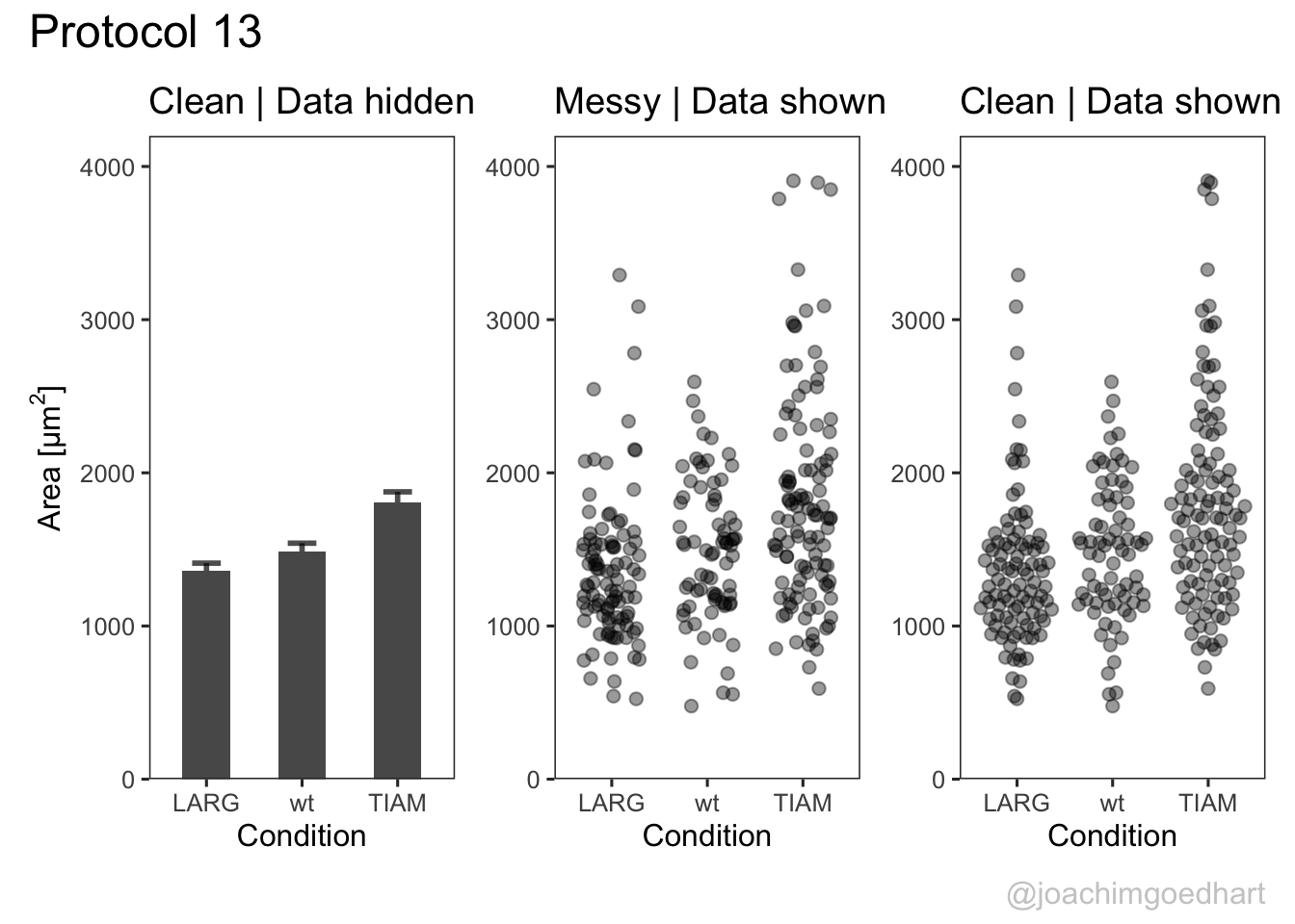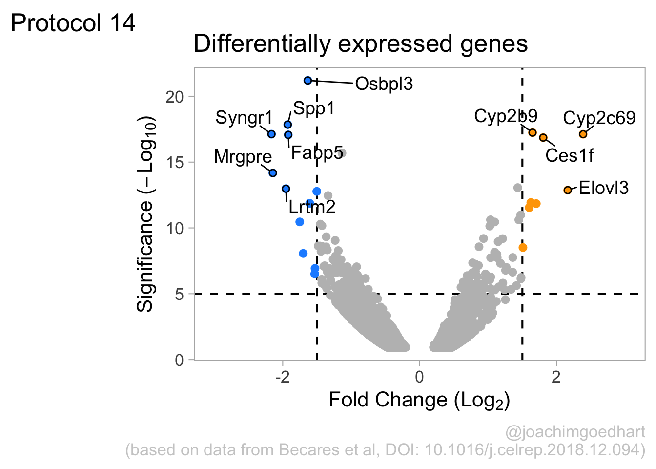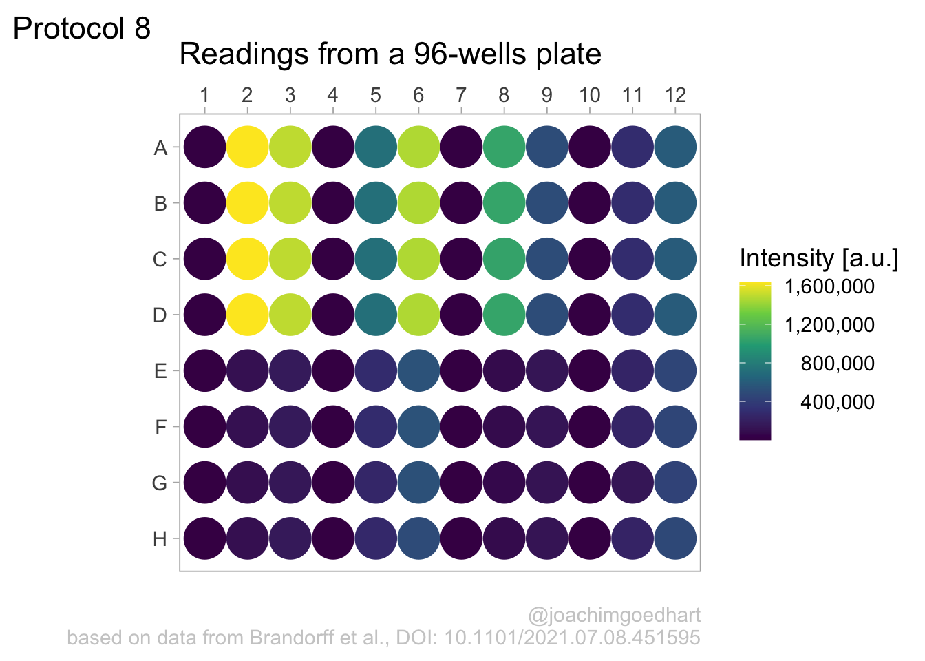 This chapter showcases several complete protocols for different kinds of data visualizations. Each protocol starts with the raw data and ends with a publication quality plot. The data is available from Github in the ‘/data’ folder on this page. The github page holds a separate Rmarkdown file for each protocol. To reproduce the data visualizations you can either take the data and follow the instructions in the chapter. Alternatively you can download the Rmarkdown file (and the data) and run it step by step. The Rmarkdown files can also be used as a starting point to apply the same visualization to your own data.