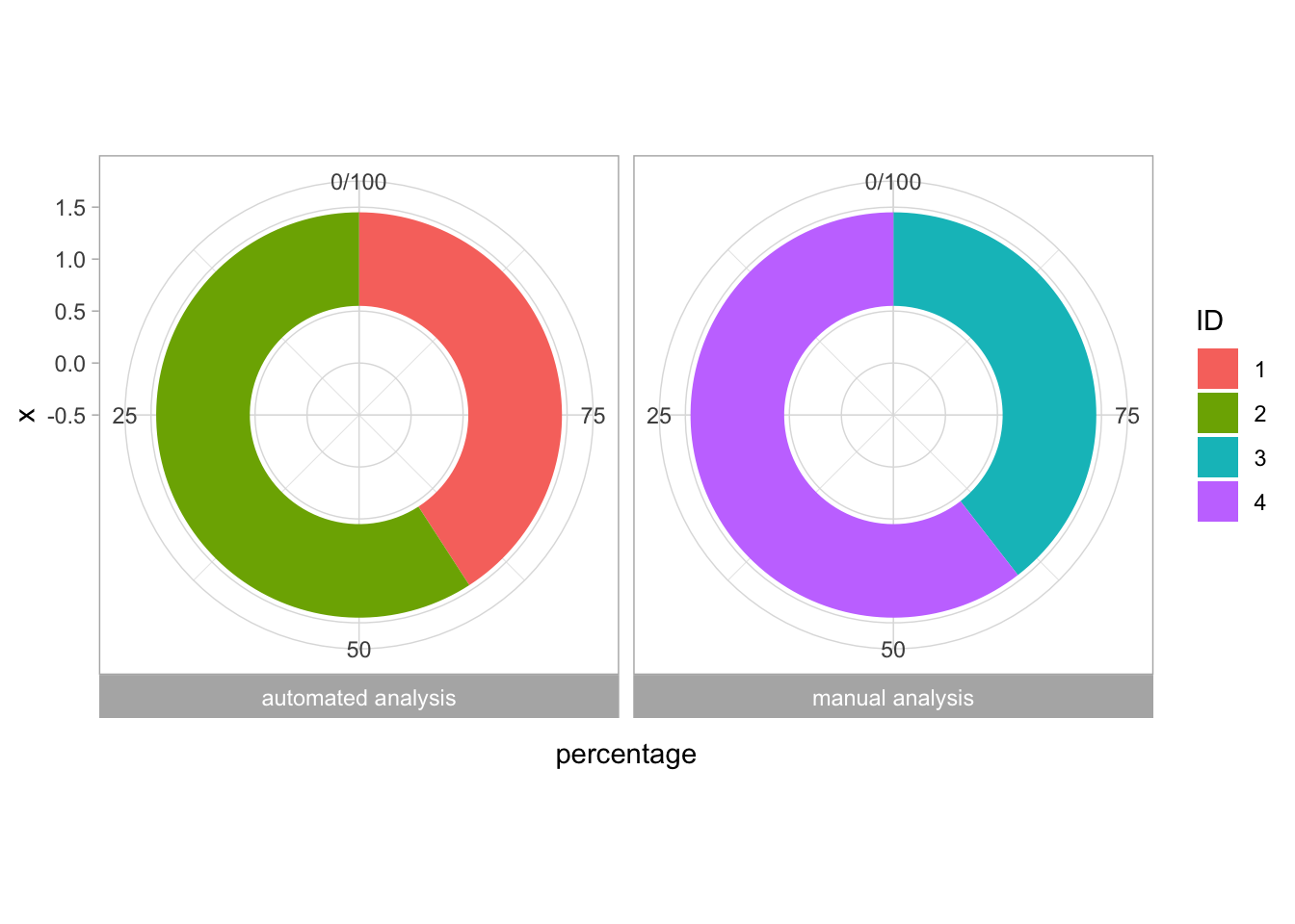Here, the y values fill up the 360 degrees of the pie chart, and the x value defines the width of the curved band. This can be turned into a donut chart by changing the x limits. We also move the labels of the facets to the bottom by defining strip.position = "bottom", as this looks better in the final figure: