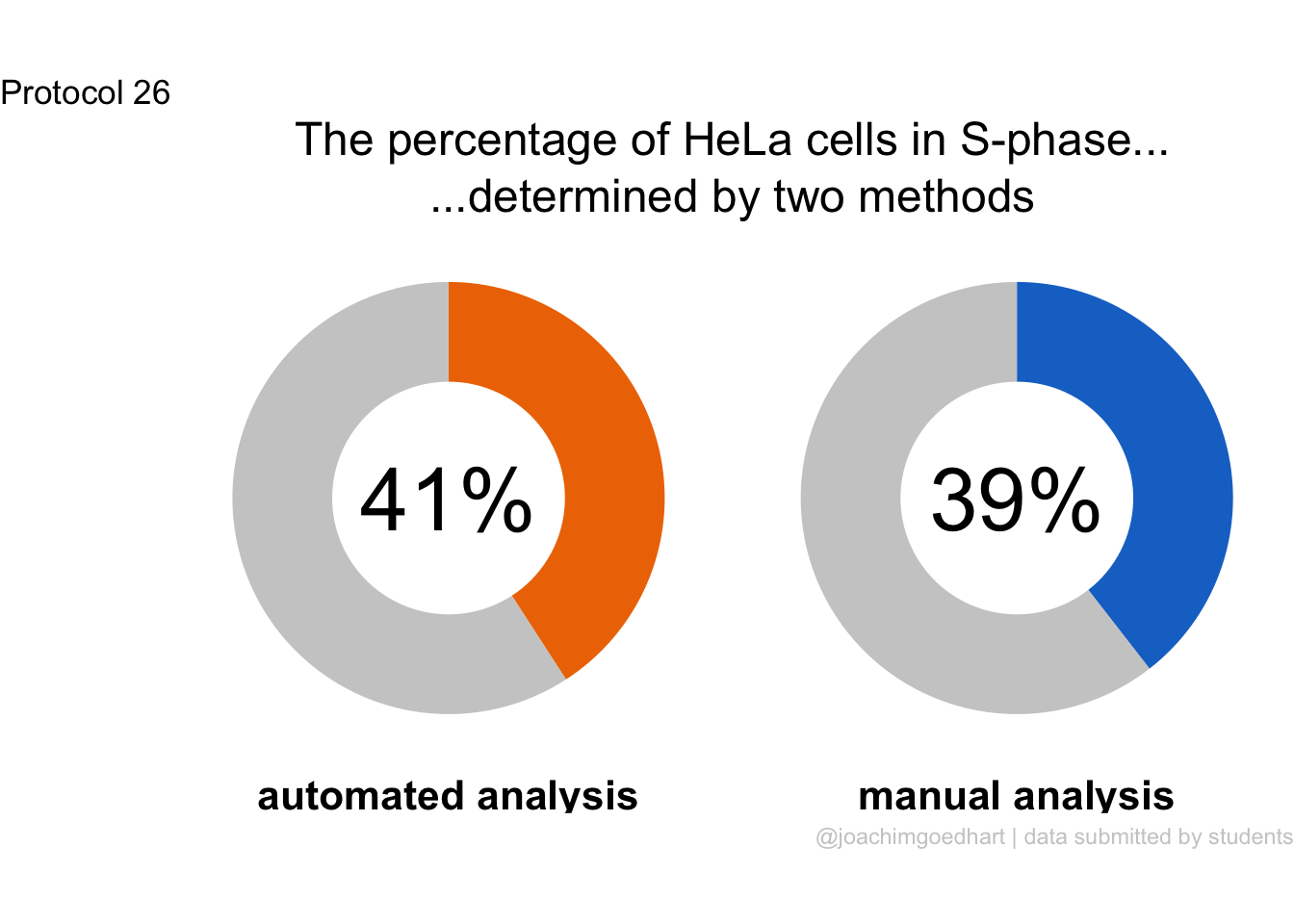The hole in the donut is often used to display a number, in this case we can add the percentage, to state the percentage of cells in the S-phase. To this end, we can filter the dataframe to get the right labels: