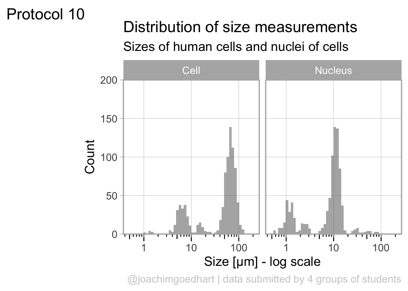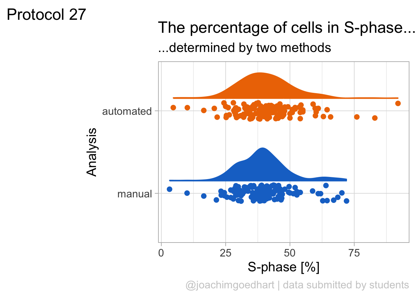 The donut chart that we’ve seen in protocol 26 summarizes a rich dataset in a single value. While this simplification can be a powerful way to communicate results, we may be interested in the underlying data. A comprehensive way to show all data and its distribution is the raincloud plot. This is a recent innovation that was reported by Micha Allen and colleagues. We will use the same dataset as for protocol 26 to generate a raincloud plot and this will nicely contrast with the donut chart. Let’s again load the data on the percentage of HeLa cells in the S-phase: