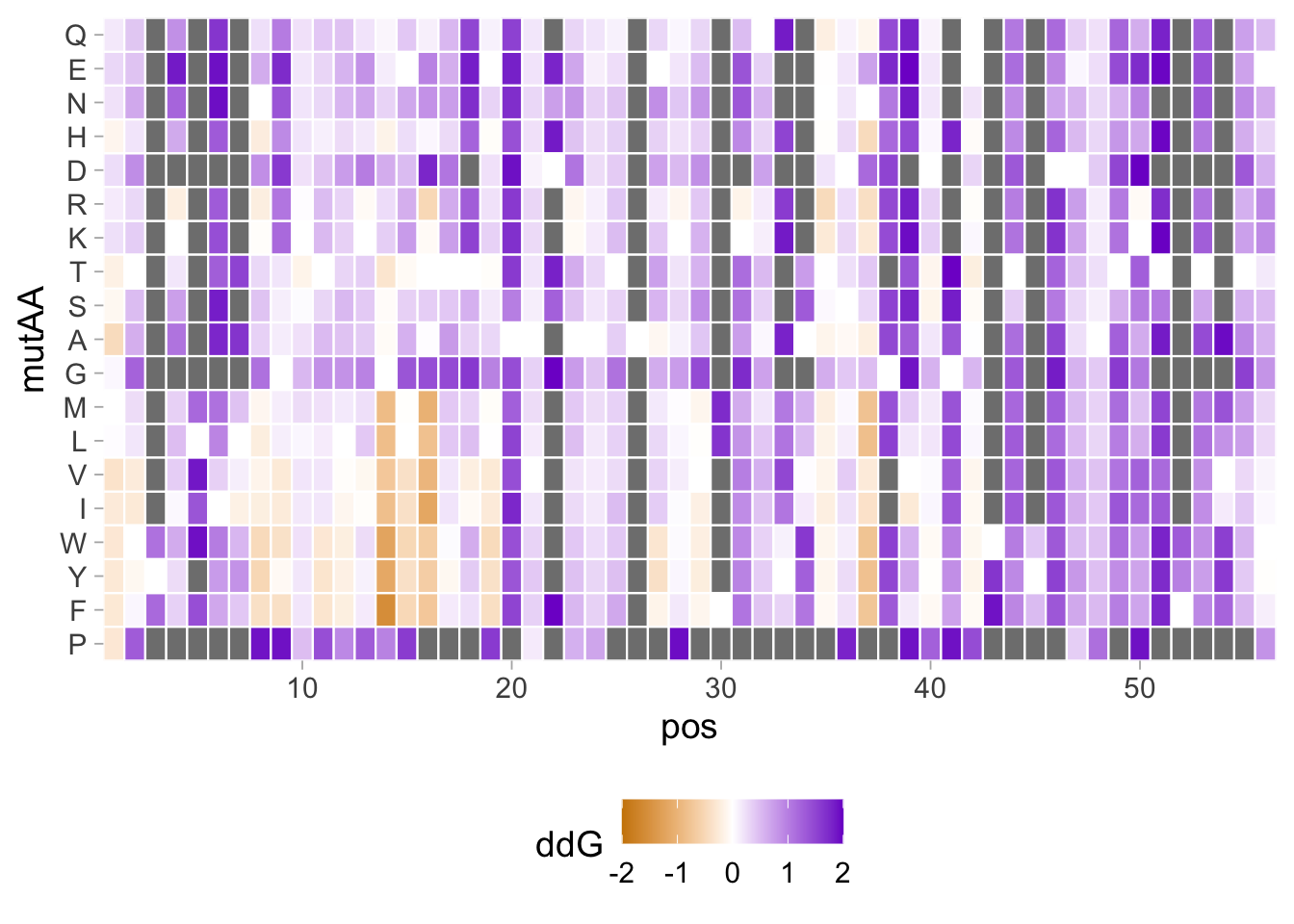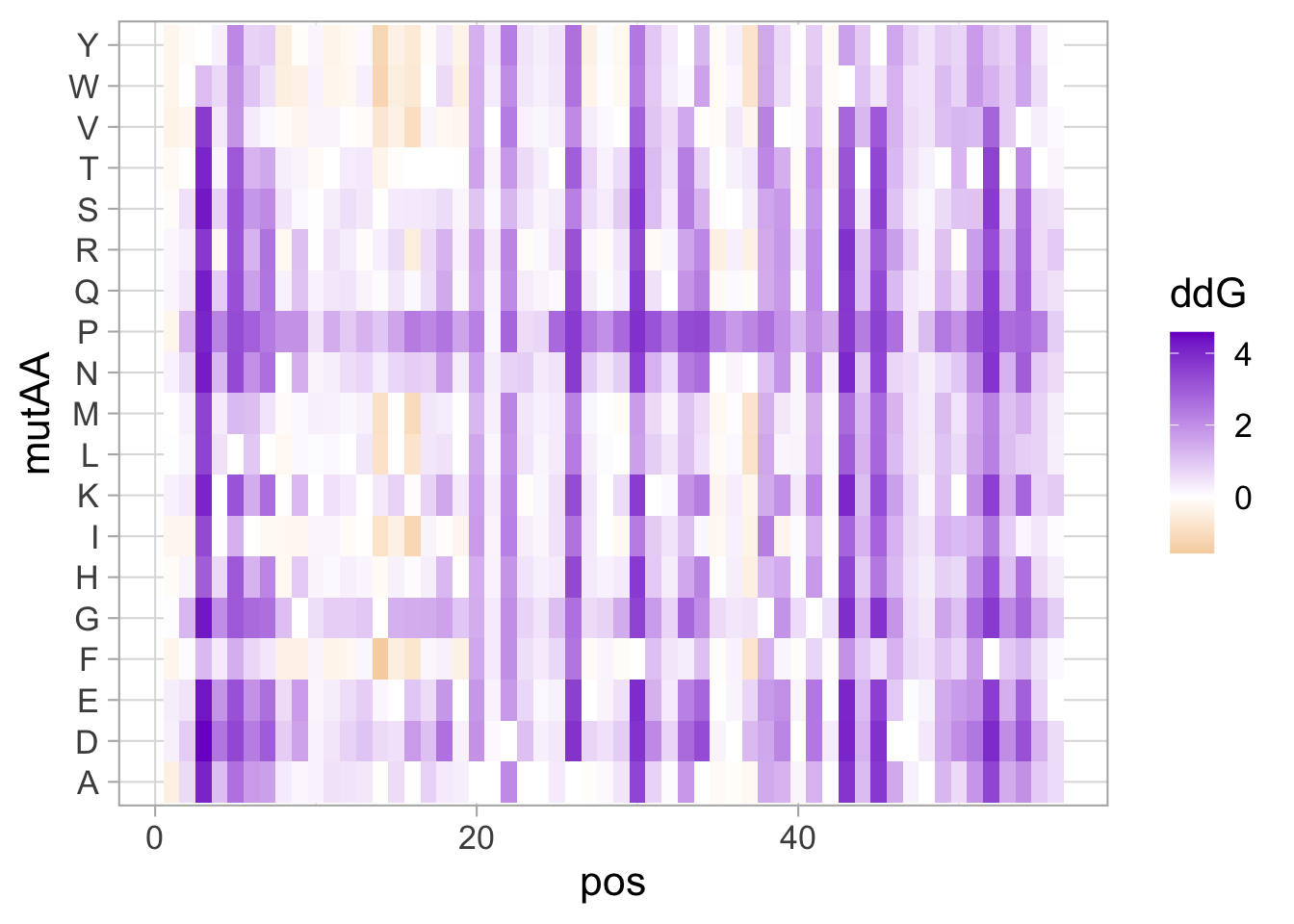 ThermoMPNN is a deep neural network that predicts the effect of single amino acid changes on the stability of a protein. A notebook can be accessed via google colab to run the predictions and the output is a heatmap, showing the effect of each mutation. The heatmap is generated in the notebook with python code and here I reproduce the plot with ggplot2 as it is a nice example of constructing a heatmap. The data underlying the heatmap can be exported as a CSV file and that is what we are using here to create the plot.