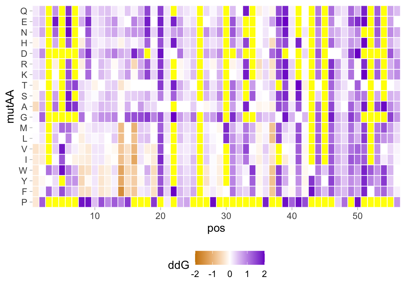 We see a lot of red boxes, which reflect ddG values that exceed 2. Since these ddG values exceed the extremes, these are treated as na.value, as can be visualized by assigning a yellow color to these: