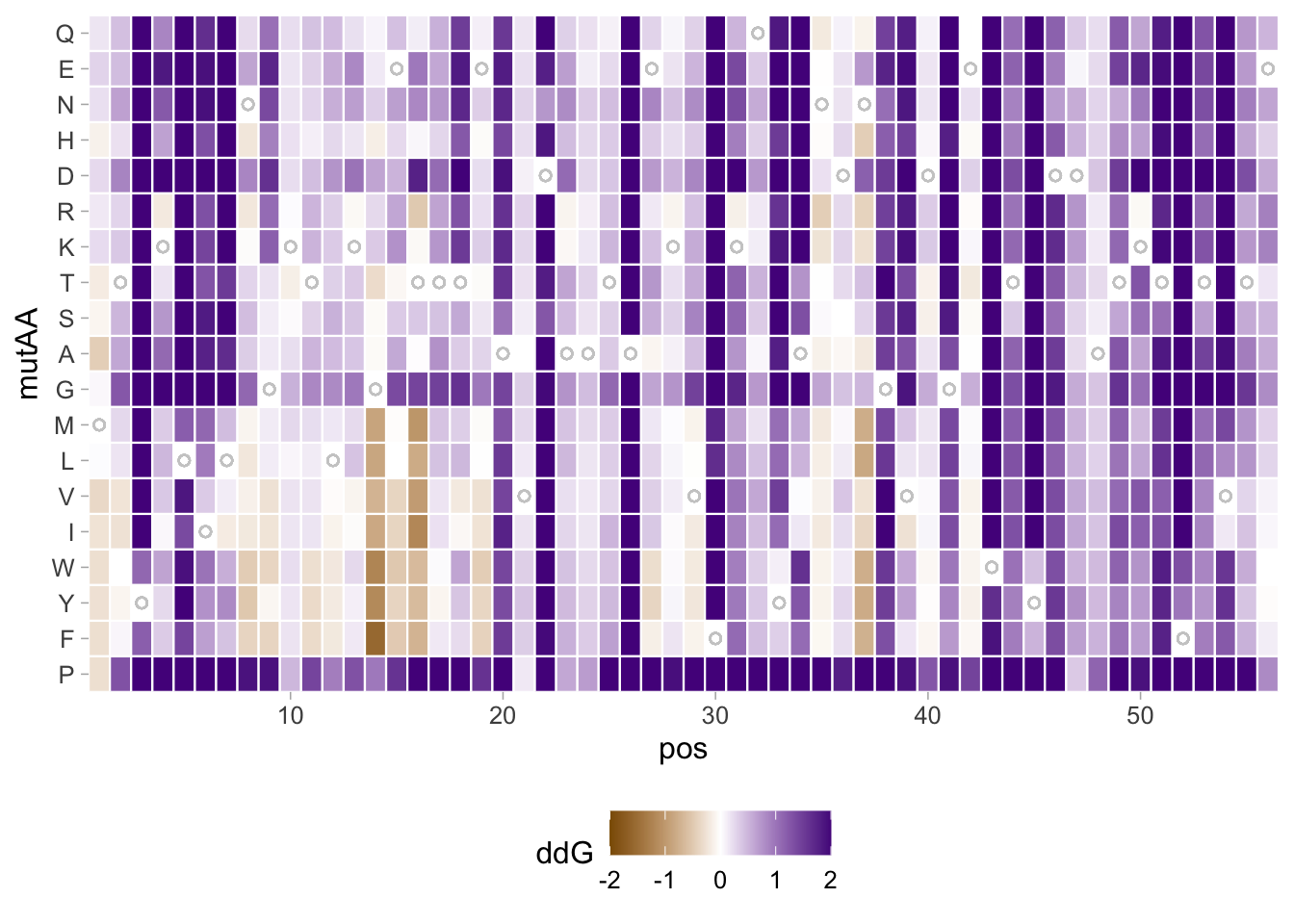 This is not cool. Ideally, the out of bounds values should be clipped to the extremes at the ends of the colorscale. To this end we need to load another package {scales} and define in the scale_fill_gradient2() function oob=squish, defining hwo to treat values that are out-of-bounds (oob). In addition, I like to highlight the wild-type residues and these are indicated by geom_point():